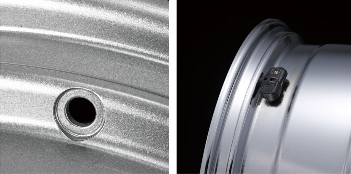国内自動車メーカー純正設定「タイヤ空気圧センサーバルブ(TPMS)」が取付けられるバルブ孔加工を施しています。