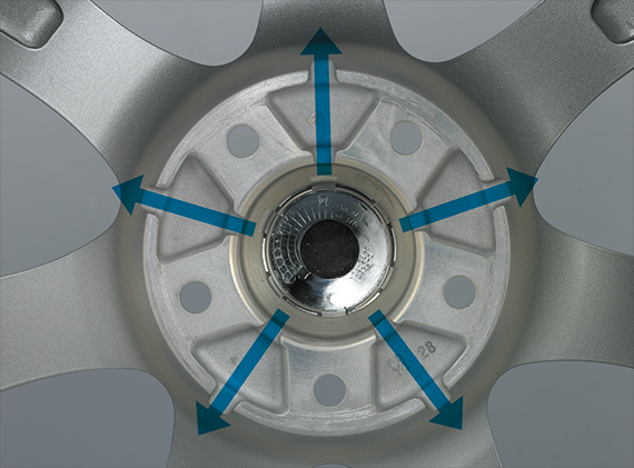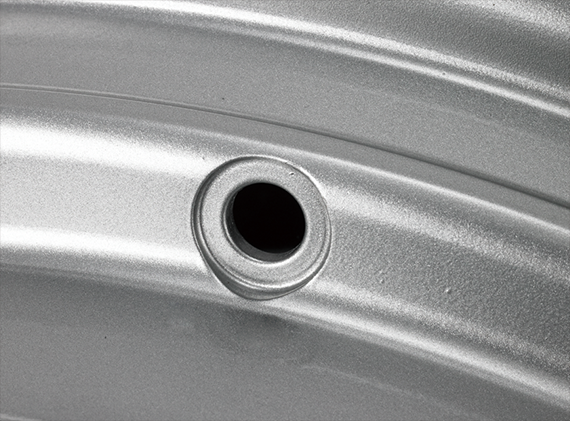 TPMSのセンサーバルブの装着安定性を考慮したバルブ穴加工を採用。