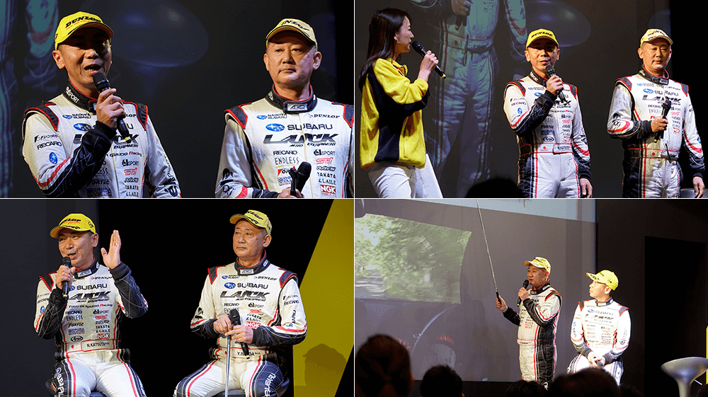 2つめのトークショーのテーマは「ラリー楽しみ方指南」です。ゲストには2016年シーズンの全日本ラリー選手権で、DUNLOPのラリー用タイヤを履いたSUBARU WRX STIを駆ってチャンピオンに輝いた勝田範彦選手とコ・ドライバーの石田裕一選手を招きました。