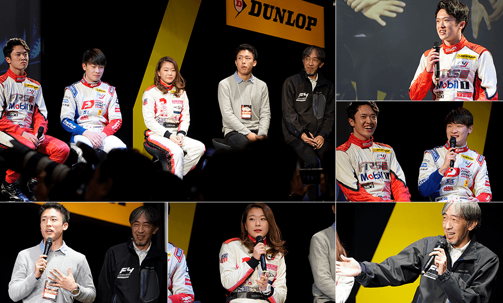 この日、ステージに立ったのは、FIA F4のプロジェクトリーダーである服部尚貴さん、2016年FIA F4ジャパニーズチャンピオンシップ チャンピオンの宮田莉朋選手、同年間2位の阪口晴南選手、そして女性ドライバーを代表して牛井渕琴夏選手。