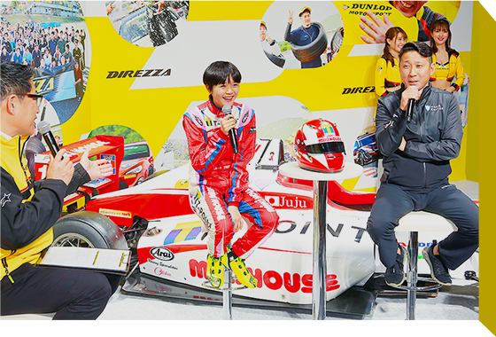 弱冠9歳でフォーミュラカーレースデビューを果たした、レーシングドライバー・Juju(野田樹潤)選手。ブースでは、そんな彼女がUNDER17で操縦した車両を展示。ダンロップのタイヤはレースの世界でも、選手の安全・安心を守る重要な役割を担っています。