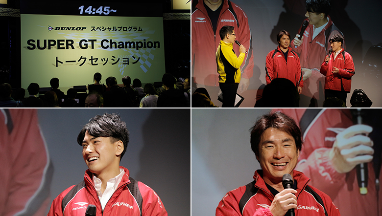 ちなみに、トークショーではSUPER GT以外の話題にも注目が集まりました。田中監督がドライバーとなり、プロモーション映像用にGAINER TANAX GT-Rを完全封鎖のMAZDAターンパイク箱根(旧・箱根ターンパイク)で走らせたのです。タイヤはレース用で、路面はセミウエット。でも、「サーキットと同様、タイヤは有効なグリップを発生し、ダウンフォースも十分に利いた」そうです。「レース用タイヤといえども、基本は公道用タイヤとつながっている。転がり抵抗の低減と高グリップとの両立とかね」。DUNLOPはレースを技術開発のひとつの場として捉えています。過酷な走行状況ではタイヤの多様なデータ蓄積が可能で、それを活用すればタイヤの要求案件、具体的にはドライおよびウエットのグリップ力や耐摩耗性、直進安定性、転がり抵抗を踏まえた省燃費性能などの向上につなげられるからです。田中監督の言葉は、まさにDUNLOPの姿勢を代弁するものでした。