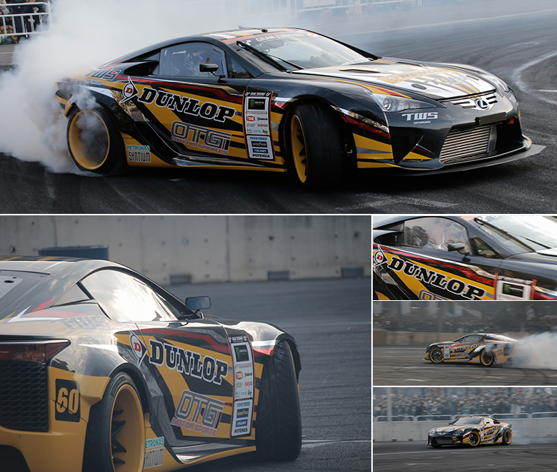 DUNLOPはブース以外でも来場者から大きな注目を集めました。野外イベントスペースに設けられた特設コースにおいてエキジビションマッチの「D1GP Kick Off Drift」が催され、そこでDUNLOPタイヤを装着して「D1 GRAND PRIX SERIES」に参戦する今村陽一選手(OTG Motor Sports)が豪快な走りを見せたのです。マシンはブラック&イエローのニューカラーで彩られたレクサスLFA。エンジンはNASCAR用のV8エンジンに換装されています。当日の今村選手は、東京オートサロンのアンバサダーである哀川翔さんを乗せて単独走行も披露。その過激な走りに、哀川さんは「人生が変わりそう」と感嘆していました。