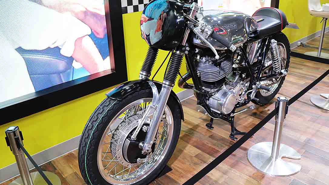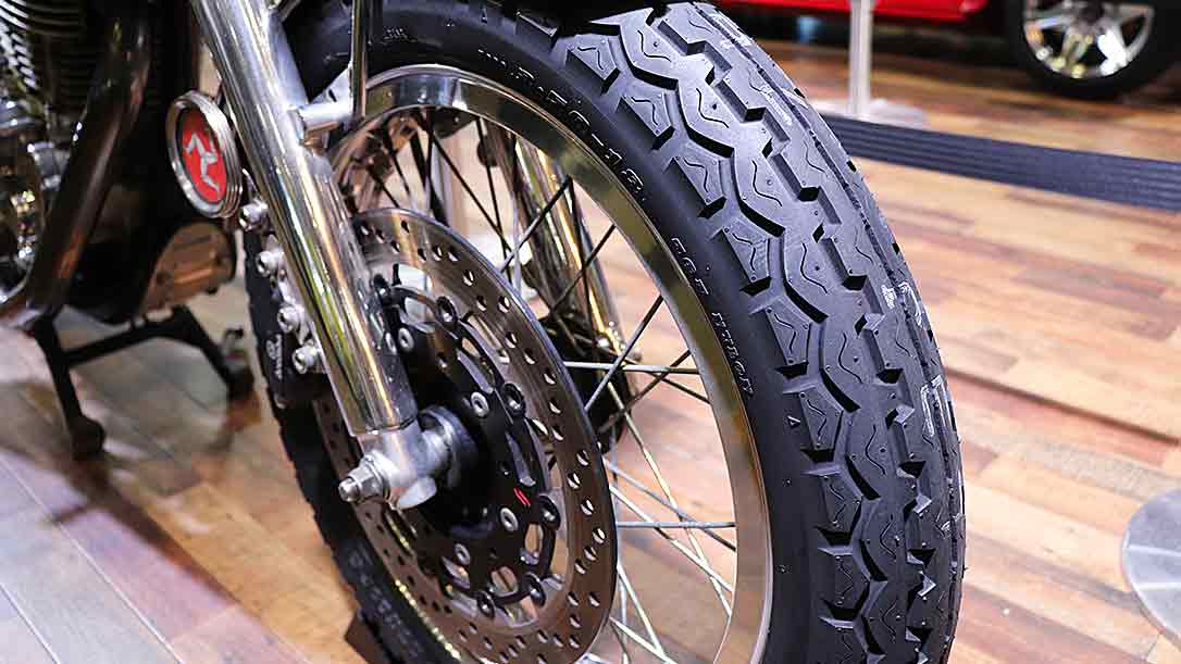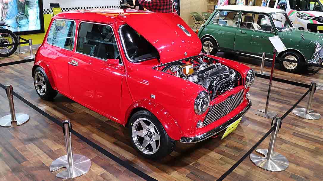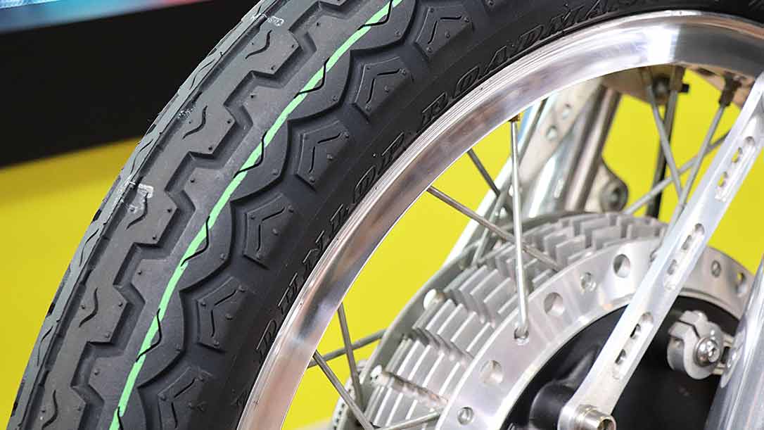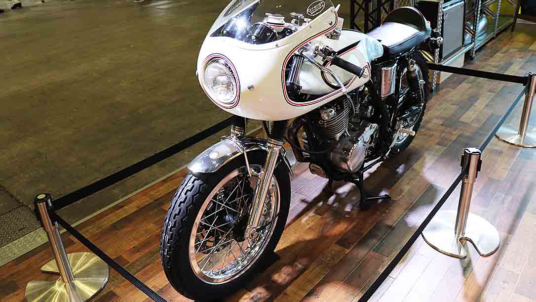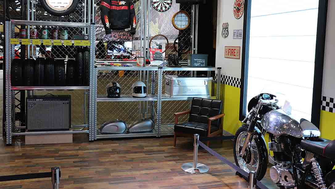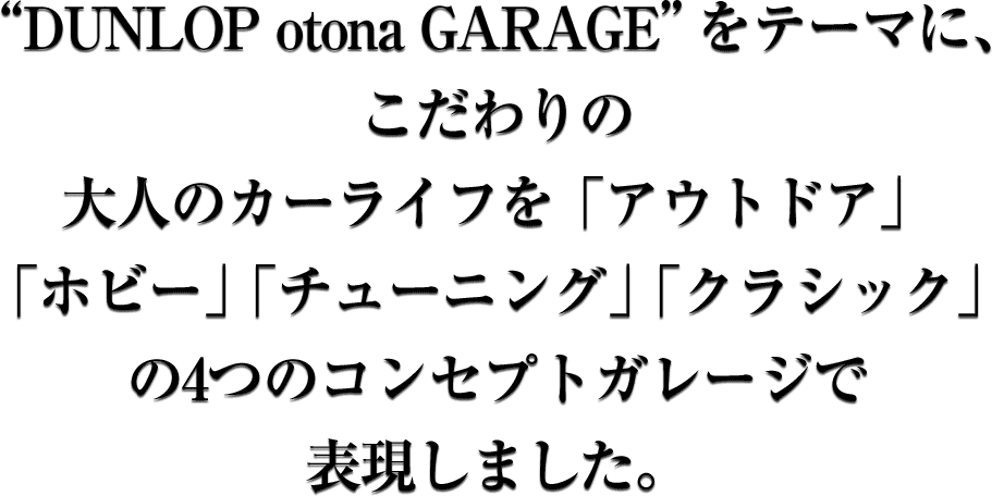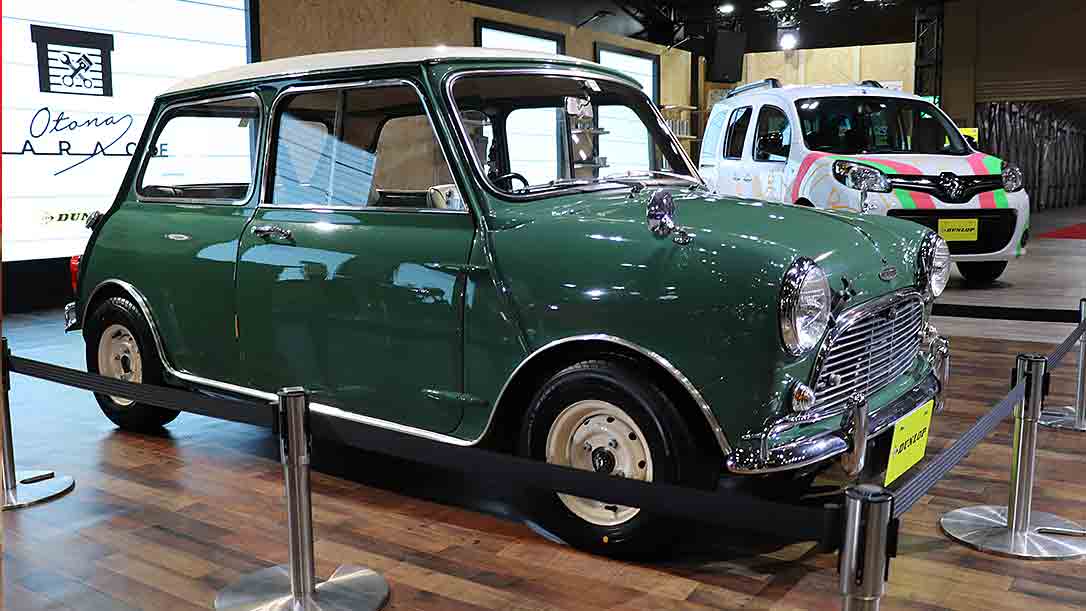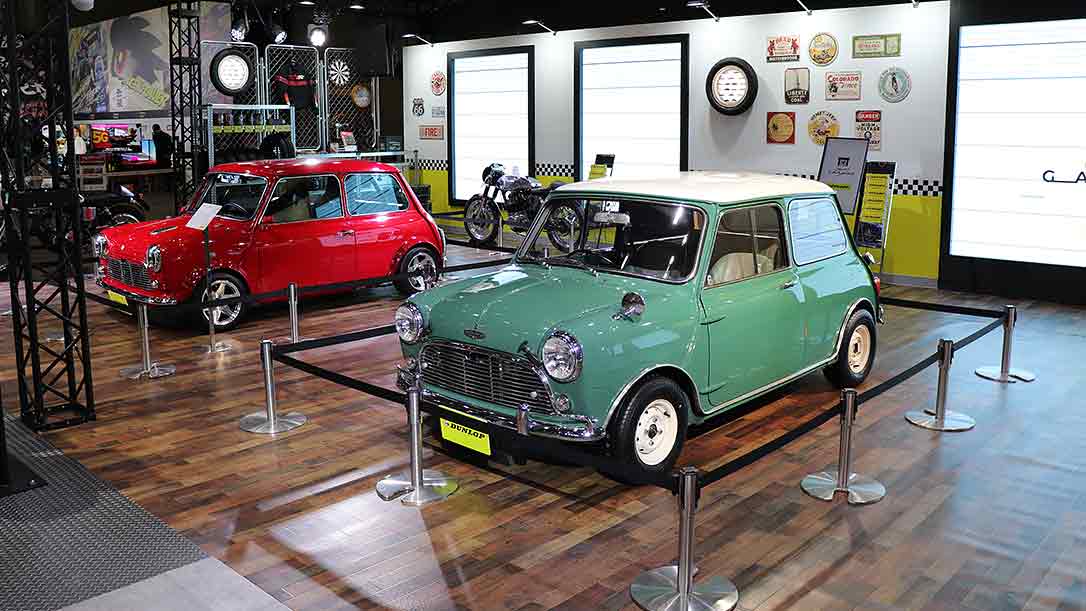 クラシックゾーンのテーマはドライブ・ツーリングが好きな大人の夫婦のガレージ。 SP SPORT R7を装着したローバー・ミニ・クーパーとLE MANS J-CINQを装着したオースチン・ミニ・クーパー、そして、ビンテージ・スポーツタイヤのTT100GPを装着したSR400の2台を展示。夫婦で楽しめる空間を作りました。