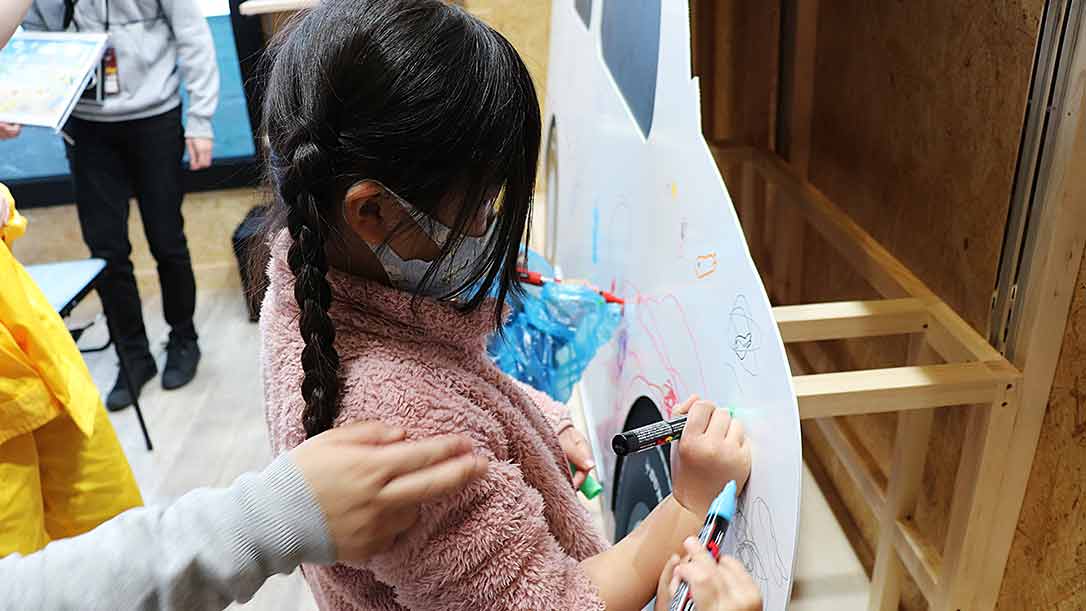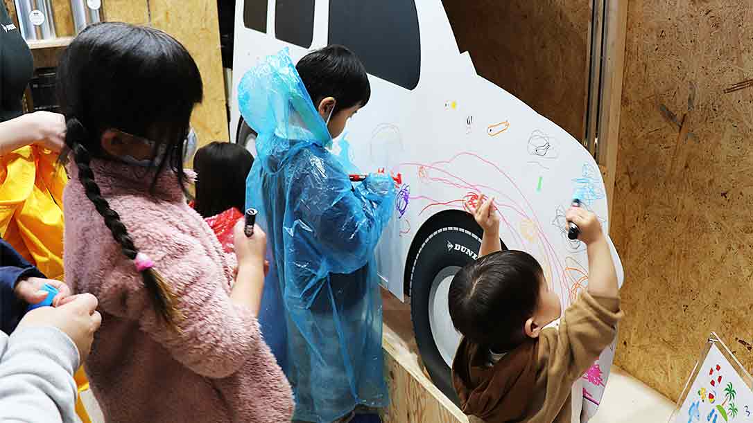 アーティストの松崎大輔さんをお招きして、カングーへのライブペインティングを実施。その横では子どもたちが思い思いの絵を描くペイントワークショップを開催しました。