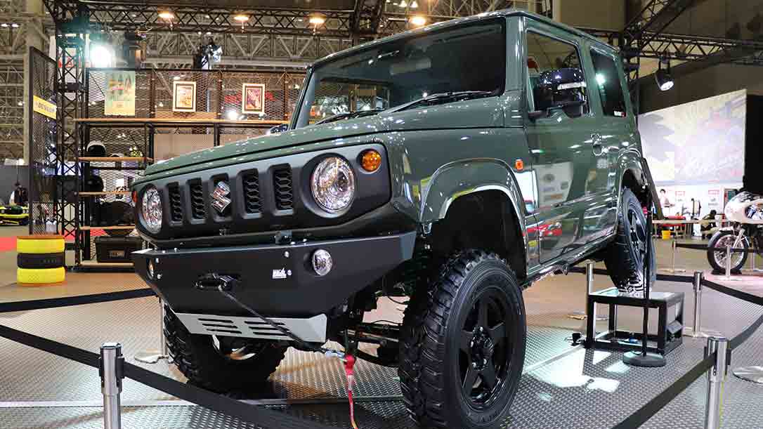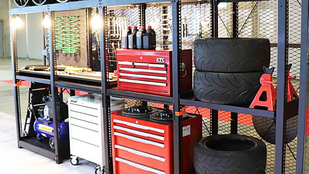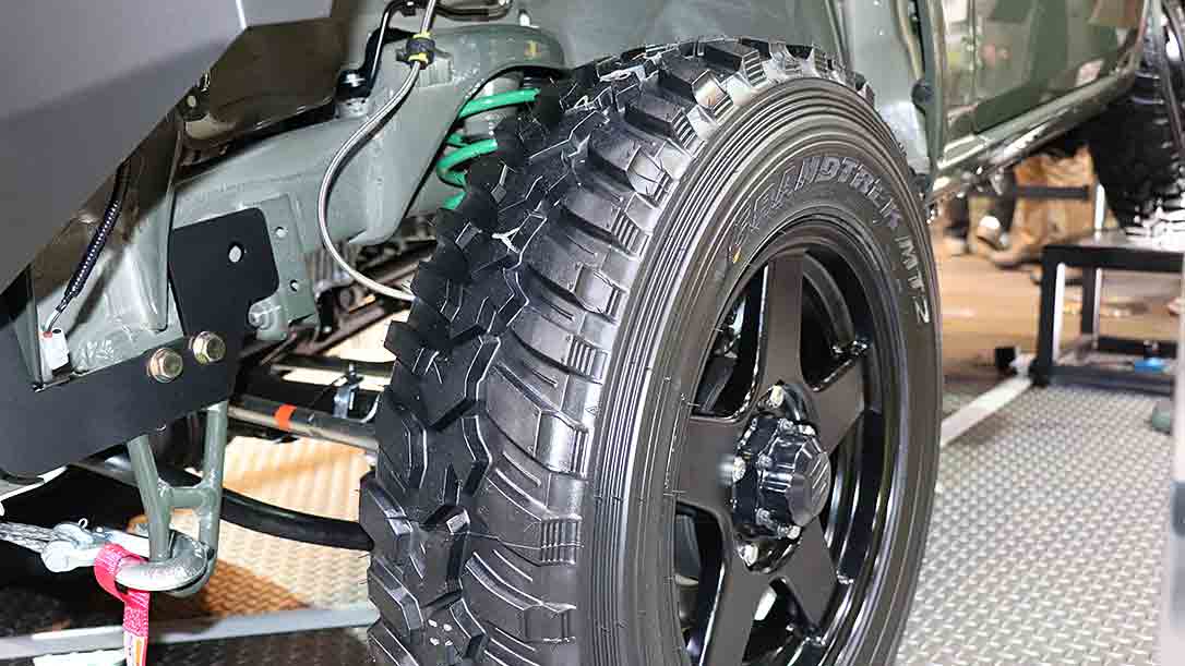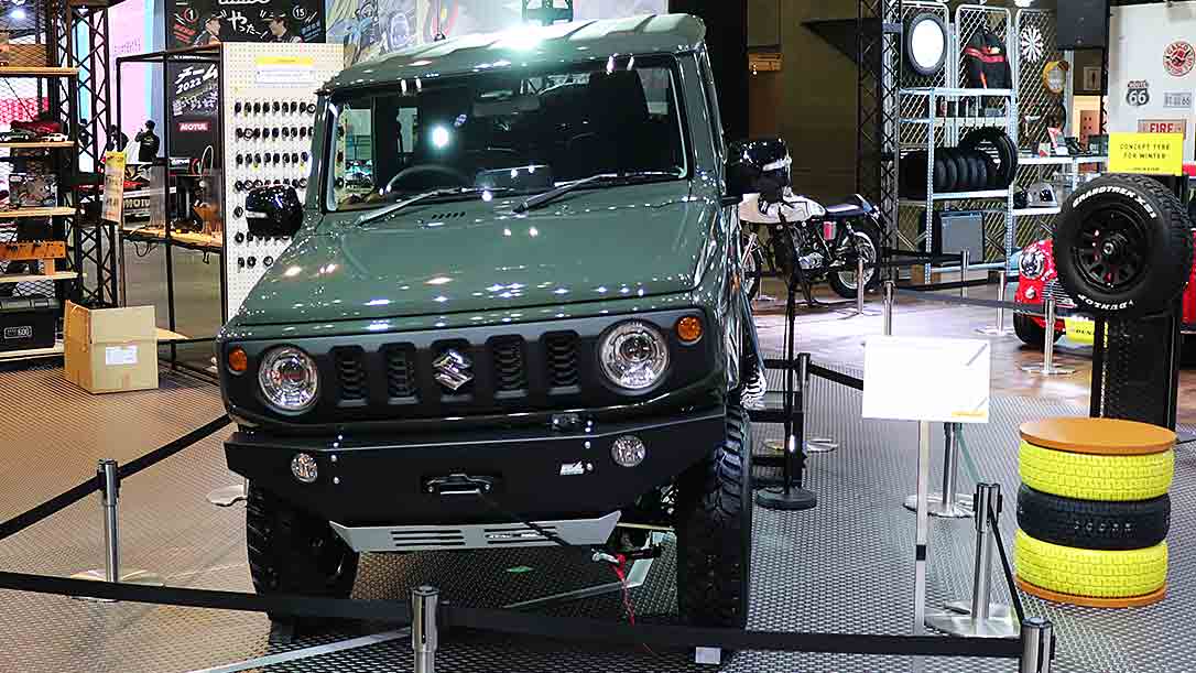ホビーゾーンでは、遊び第一主義の趣味人のガレージを制作しました。3インチリフトアップさせたジムニーの片側後輪を台上げし、普段見ることのできないタイヤの接地面をモニターを介して見て頂きました。ジムニーの足元にはオフロードを楽しめるGRANDTREK MT2を装着しました。