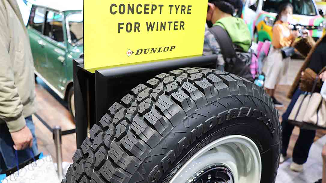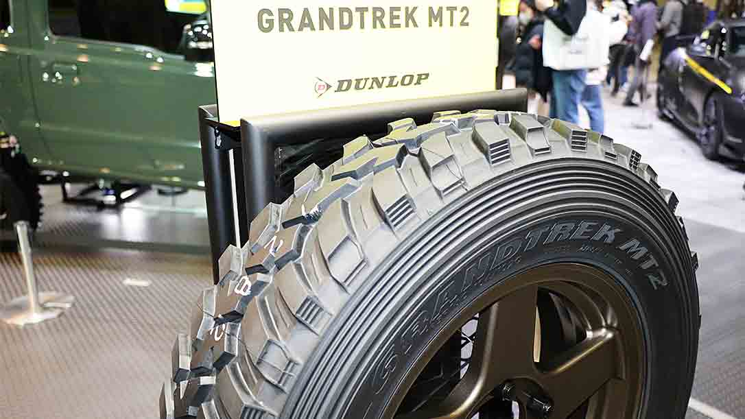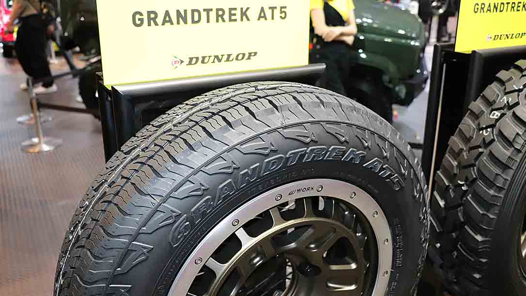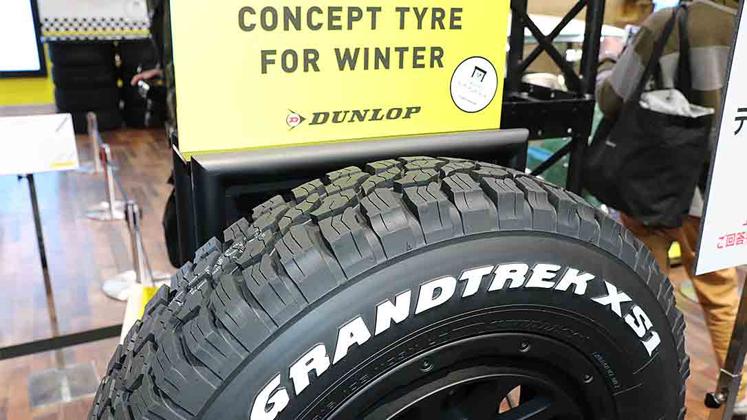 展示タイヤには、GRANDTREK AT5、GRANDTREK MT2とコンセプトタイヤの2本を展示。コンセプトタイヤは、トレッドデザインが異なる、ブラックレターとホワイトレターを展示し、来場者にどちらのデザインが好みかアンケートを行いました。