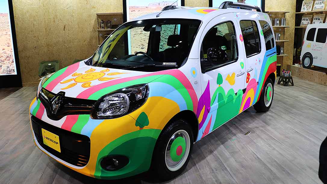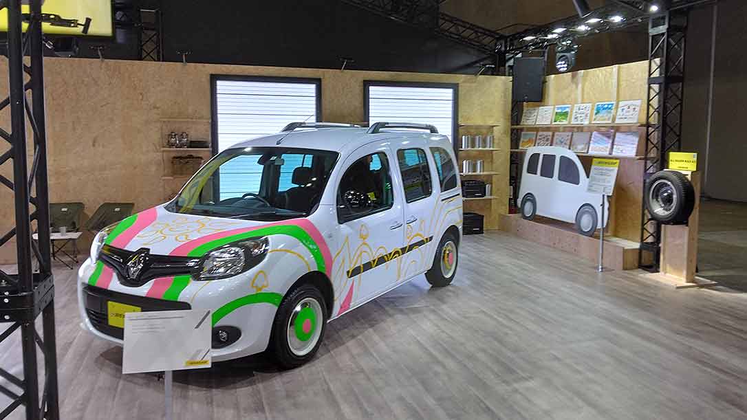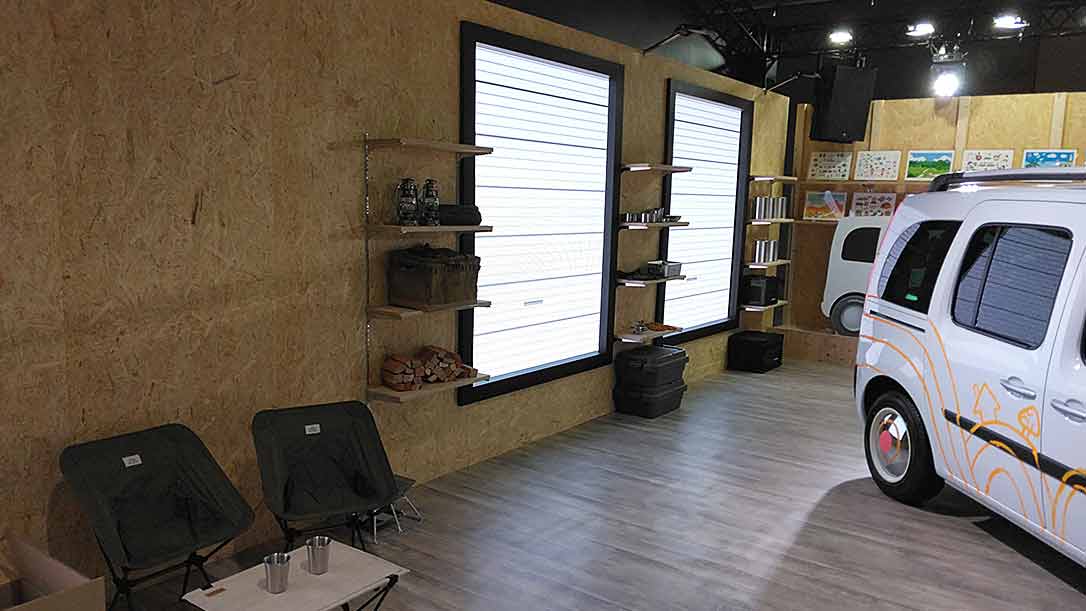アウトドアゾーンでは、キャンプに行く家族をイメージしたガレージを作りました。 展示車両は、ルノー カングー。会期中、ライブペイントを行い、お子様にも人気の華やかな車両に仕上げました。