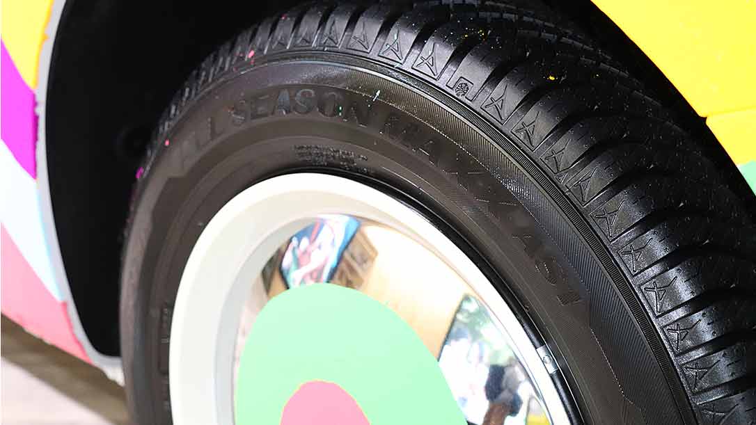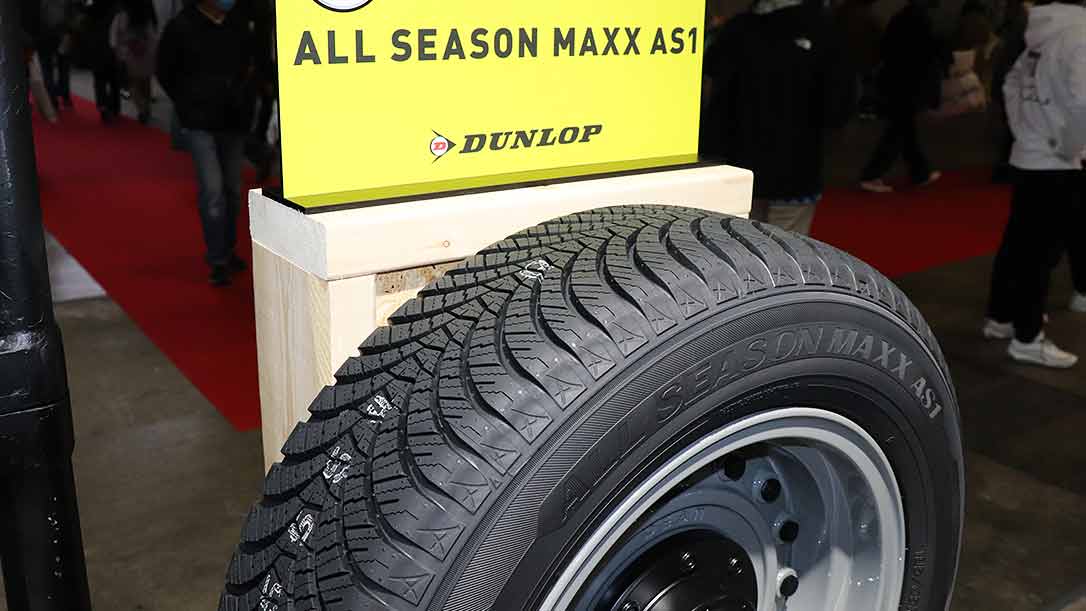 展示車両と展示タイヤはALL SEASON MAXX AS1を展示しました。家族での旅行中、突然の雪でも慌てずに走ることができます。スノーフレークマークもついているので、高速道路冬用タイヤ規制でも走行が可能です。
