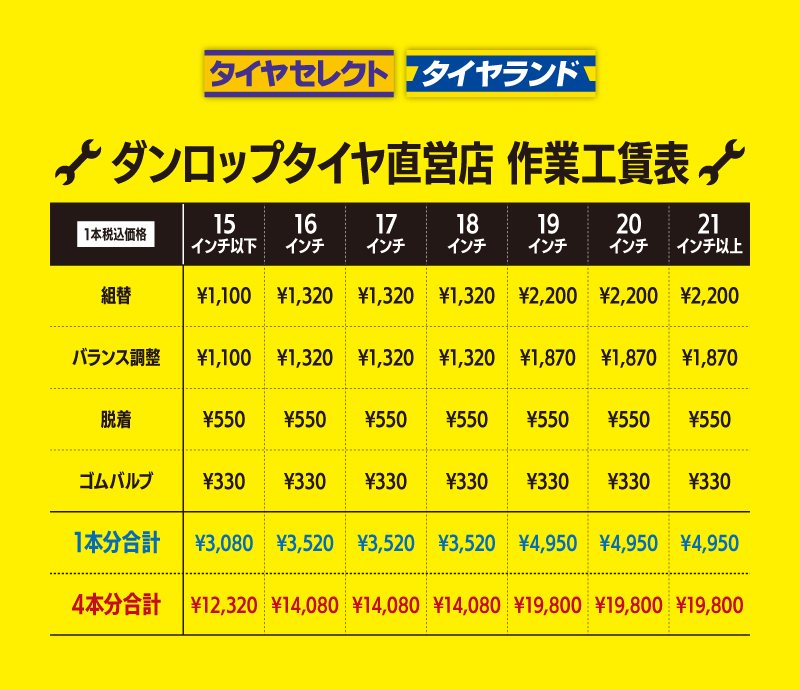 ※交換料金には、車体からタイヤとホイールの脱着料、タイヤとホイールの組み替え、バランス作業、ゴムバルブ交換が含まれております。